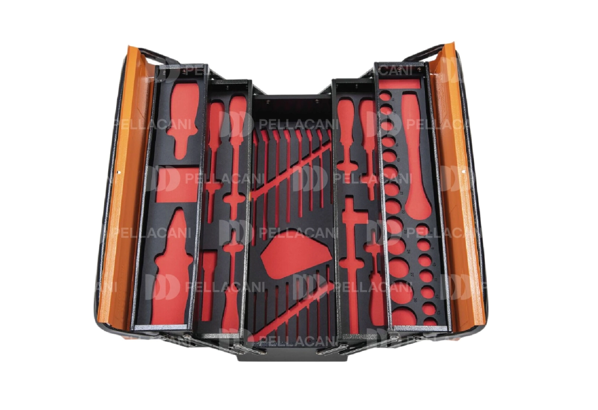 Contiene pinzas, destornilladores punta plana y punta cruz, juego de llaves hexagonales, llaves combinadas, dados hexagonales, mango T, extensión y junta universal